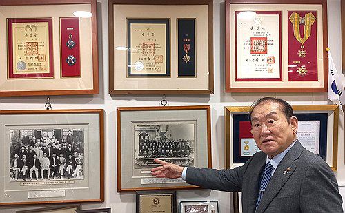 상하이 임시정부 사진을 가리키는 라종억 이사장