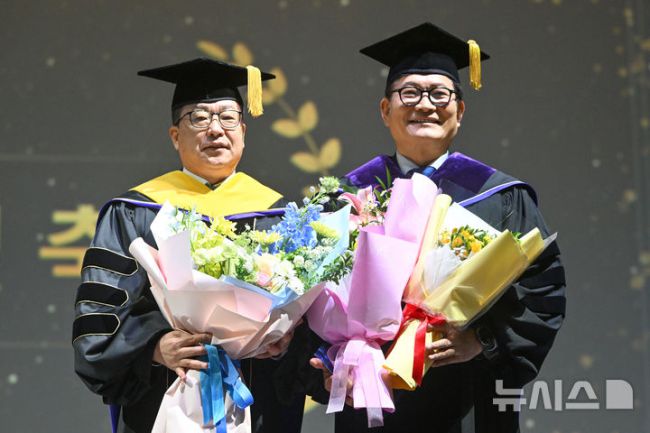 [광주=뉴시스] 이영주 기자 = 송영길(오른쪽) 전 더불어민주당 당대표가 25일 오전 광주 동구 조선대학교 해오름관에서 열린 2025학년도 대학원 석·박사 학위수여식에 참여해 김춘성 조선대 총장과 기념사진을 촬영하고 있다. 2026.02.25. leeyj2t78@newsis.com [사진 영상 제보받습니다] 공감언론 뉴시스가 독자 여러분의 소중한 제보를 기