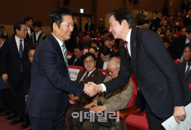 정청래 더불어민주당 대표와 조국 조국혁신당 대표가 25일 오후 서울 여의도 국회 의원회관에서 열린 5·18정신 헌법전문수록 개헌 촉구 국민결의대회에 참석, 악수하고 있다.