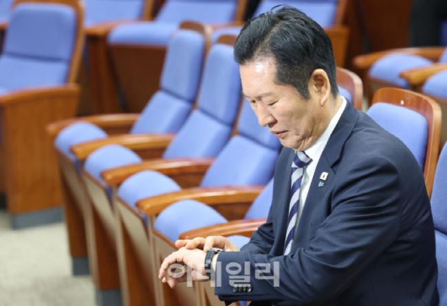정청래 더불어민주당 대표가 26일 오후 서울 여의도 국회에서 열린 의원총회에 참석, 시간을 확인하고 있다.