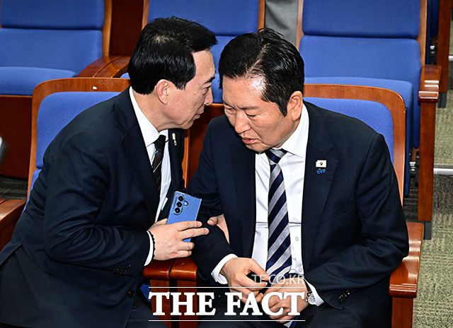 정청래 더불어민주당 대표가 26일 오후 서울 여의도 국회에서 열린 의원총회에 참석해 박수현 수석대변인(왼쪽)과 대화를 하고 있다. hany@tf.co.kr 사진영상기획부 photo@tf.co.kr 발로 뛰는 더팩트는 24시간 여러분의 제보를 기다립니다. ▶카카오톡: '더팩트제보' 검색 ▶이메일: jebo@tf.co.kr ▶뉴스 홈페이지: http://tal