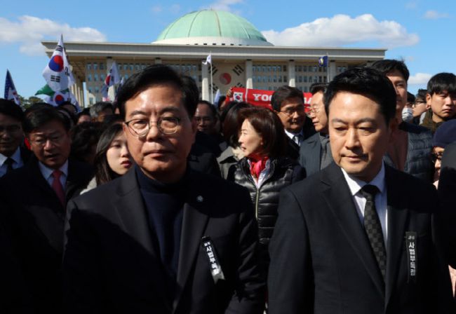 장동혁 국민의힘 대표와 송언석 원내대표를 비롯한 지도부가 3일 서울 여의도 국회 본관 앞에서 열린 사법독립 헌정수호를 위한 대국민 호소 국민대장정 규탄대회를 마친 뒤, 청와대를 향해 행진하고 있다. 장동혁 국민의힘 대표와 송언석 원내대표를 비롯한 지도부가 3일 서울 여의도 국회 본관 앞에서 열린 사법독립 헌정수호를 위한 대국민 호소 국민대장정 규탄대회를 마