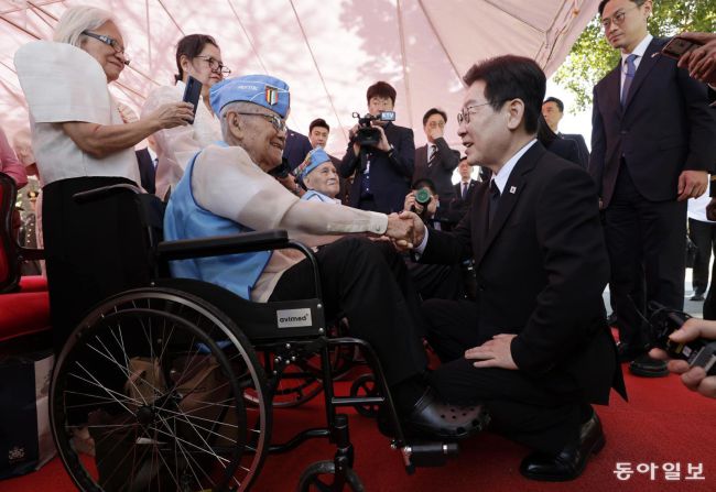 이재명 대통령이 4일 오전 필리핀 마닐라 국립묘지인 영웅묘지를 방문해 참전용사들과 인사를 나누고 있다. 마닐라=송은석 기자 silverstone@donga.com 이 대통령이 필리핀 국빈 방문 이틀째인 4일 오전 필리핀 마닐라 영웅묘지 내 한국전 참전기념비를 찾아 헌화하고 참전용사들을 접견했다. 필리핀은 한국전쟁 당시 아시아 국가 가운데 최초이자 최대 규모