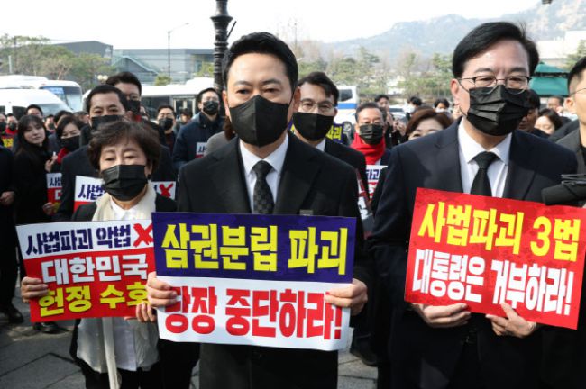 장동혁 국민의힘 대표와 송언석 원내대표를 비롯한 소속 의원들이 5일 청와대 사랑채 앞에서 의원총회를 마친 뒤 손팻말을 들고 청와대 방향으로 이동하고 있다. 장동혁 국민의힘 대표와 송언석 원내대표를 비롯한 소속 의원들이 5일 청와대 사랑채 앞에서 의원총회를 마친 뒤 손팻말을 들고 청와대 방향으로 이동하고 있다.