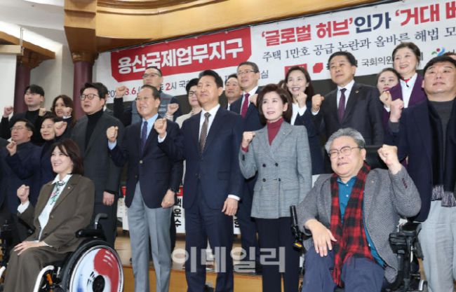 오세훈 서울시장, 권영세, 나경원 국민의힘 의원 및 참석자들이 6일 서울 여의도 국회 의원회관에서 열린 용산국제업무지구 ‘글로벌 허브’인가 ‘거대 베드타운’인가?‘ 정책 토론회에 참석, 기념촬영을 하고 있다.