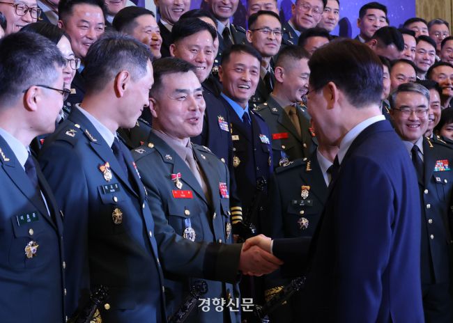 이재명 대통령이 6일 청와대 영빈관에서 열린 2026년 준장 진급 장성 삼정검 수여식에서 기념사진을 찍은 후 박정훈 국방부 조사본부장(준장) 등 진급자들과 인사하고 있다. 2026.03.06 김창길 기자 해병대 수사단장으로 채상병 순직 사건을 조사하고 외압에 저항했던 박정훈 준장이 삼정검을 받았다. 이재명 대통령은 6일 청와대 영빈관에서 준장 진급 장성들에