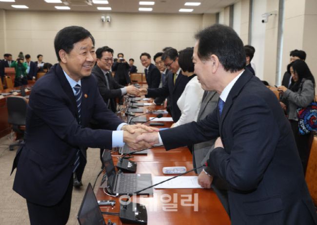 구윤철(왼쪽) 경제부총리 겸 재정경제부 장관이 9일 서울 여의도 국회에서 열린 대미투자특별법 처리를 위한 특별위원회 전체회의에서 안건 통과 후 여당 간사인 정태호 더불어민주당 의원과 악수하고 있다.