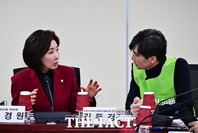나경원 국민의힘 의원(왼쪽)과 김두경 코로나19백신피해자가족협의회 회장이 13일 오전 서울 여의도 국회 의원회관 제3간담회실에서 열린 코로나19 백신 피해자를 위한 국가 책임 촉구 간담회에 참석해 대화를 하고 있다. hany@tf.co.kr 사진영상기획부 photo@tf.co.kr 발로 뛰는 더팩트는 24시간 여러분의 제보를 기다립니다. ▶카카오톡: '더팩