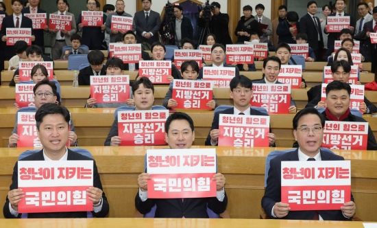 장동혁 국민의힘 대표(가운데)와 송언석 원내대표(오른쪽)가 17일 국회 의원회관에서 열린 당 중앙청년위원회·중앙대학생위원회·전국청년지방의원협의회 합동발대식에서 참석자들과 구호를 외치고 있다. <ⓒ투자가를 위한 경제콘텐츠 플랫폼, 아시아경제(www.asiae.co.kr) 무단전재 배포금지>