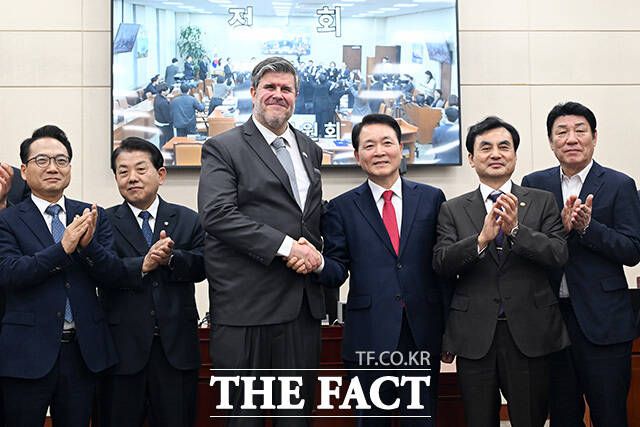 필립 라포튠 주한캐나다대사와 성일종 국회 국방위원회 위원장, 안규백 국방부 장관(왼쪽 세 번째부터) 및 국회 국방위원들이 24일 오후 서울 여의도 국회에서 열린 국방위원회 전체회의에서 대한민국과 캐나다간 국방·방산 협력 확대를 위한 결의안 가결 후 함께 기념촬영하고 있다. /국회=남용희 기자 대한민국과 캐나다간 국방·방산 협력 확대를 위한 결의안 가결 후