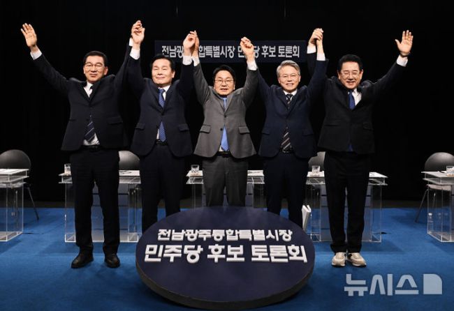 [광주=뉴시스] 이영주 기자 = 25일 광주 서구 KBC광주방송에서 열린 전남광주통합특별시장 민주당 후보 토론회에서 더불어민주당 전남광주통합특별시장 경선 후보들이 기념촬영을 하고 있다. 왼쪽부터 신정훈·주철현·강기정·민형배·김영록 후보. 2026.03.25. leeyj2578@newsis.com [사진 영상 제보받습니다] 공감언론 뉴시스가 독자 여러분의 소