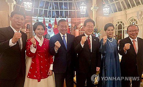 (하노이=연합뉴스) 베트남을 국빈 방문한 이재명 대통령과 김혜경 여사가 22일(현지시간) 하노이 영빈관에서 열린 국빈 환영만찬에서 또 럼 베트남 공산당 서기장 겸 국가주석 부부 및 베트남 전·현직 축구대표팀 감독과 기념촬영을 하고 있다. 왼쪽부터 김상식 현 베트남 축구 대표팀 감독, 김혜경 여사, 또 럼 서기장, 이재명 대통령, 응오 프엉 리 여사, 박항서