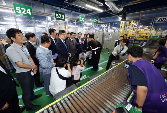 김병기 더불어민주당 대표직무대행 겸 원내대표가 16일 오전 서울 양재동 쿠팡서초1캠프를 방문해 물류 현장을 둘러보고 있다. 김 원내대표는 “폭염을 국민의 생명, 안전을 위협하는 재난으로 다뤄 선제 대응해야 한다”고 말했다. [뉴스1]