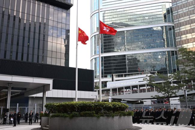 (서울=뉴스1) 박형기 기자 = 홍콩 정부가 29일부터 3일간을 홍콩 초고층 아파트 참사 애도 기간으로 지정하자 전세계에서 애도 물결이 일고 있다. 29일 홍콩 센트럴에 위치한 홍콩 정청 건물에 중국의 오성홍기와 홍콩자치구 기가 조기 형태로 걸려 있다. ⓒ AFP=뉴스1 ⓒ News1 박형기 기자 위의 장면을 클로스업한 사진. ⓒ 로이터=뉴스1 ⓒ News