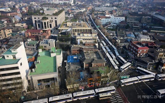 윤석열 대통령 탄핵 심판 선고를 하루 앞둔 3일 오전 서울 종로구 헌법재판소 인근에 경찰버스가 차벽을 이루고 있다. 서울경찰청 관계자는 브리핑에서 윤석열 대통령 탄핵심판 선고를 앞두고 헌법재판소 주변을 차벽으로 둘러싸는 진공상태 구역을 기존 100m에서 150m로 확장해 최종 설치를 완료했다고 밝혔다.