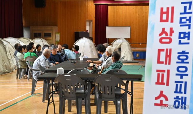 18일 오전 충청남도 예산군 고덕중학교에 설치된 비상대피소에 이재민들이 모여 있다. 예산군에 따르면 이번 호우로 인해 751명의 이재민이 발생했으며 주택 침수와 비닐하우스, 축사, 도로·하천 등 공공시설 피해 등 2900여 건에 대한 막대한 재산 피해가 발생했다.