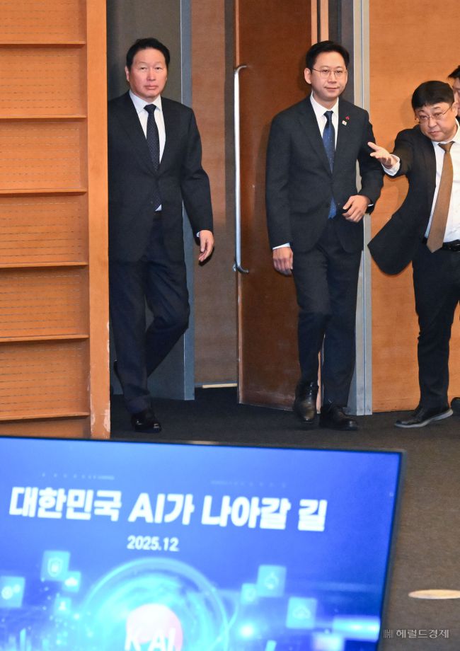 배경훈(오른쪽) 부총리 겸 과학기술정보통신부 장관과 최태원 대한상공회의소 회장이 18일 오전 서울 중구 대한상공회의소 국제회의장에서 열린 CEO 조찬간담회에 참석하고 있다.