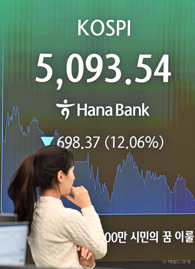 코스피 지수가 4일 미국과 이란 간 전쟁 발발 여파로 역대 최대 폭으로 폭락해 전장보다 698.37포인트(12.06%) 내린 5,093.54에 장을 마쳤다. 이날 오후 서울 중구 하나은행 딜링룸 전광판에 코스피 지수가 표시돼 있다.