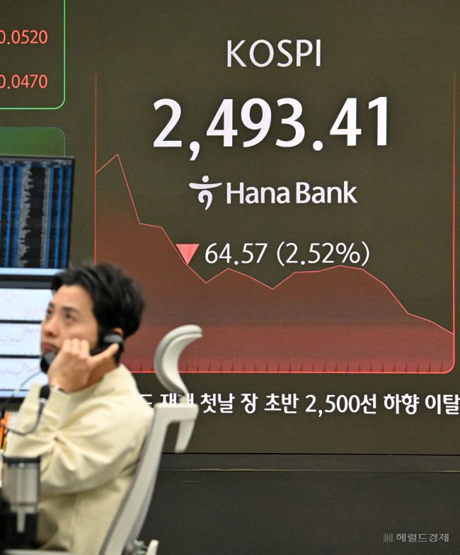 코스피가 공매도 재개 첫날인 31일 장 초반 단숨에 2,490대로 밀려났다. 지수는 전장 대비 44.54포인트(1.74%) 내린 2,513.44로 출발한 후 낙폭이 커지고 있다. 31일 오전 서울 중구 하나은행 딜링룸 전광판에 9시 17분 기준 코스피 지수가 64.57포인트 하락한 2493.41포인트를 나타내고 있다.