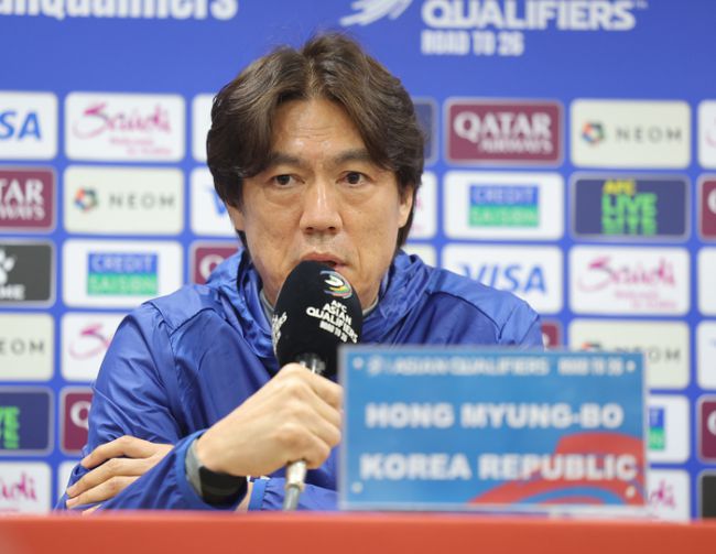 요르단전 앞둔 홍명보 감독이 24일 공식 기자회견에서 취재진의 질문에 답하고 있다. 사진 | 수원=연합뉴스 “밀집 수비 깨는 방법은 있다.” 홍명보 감독이 이끄는 축구대표팀은 25일 오후 8시 수월월드컵경기장에서 2026 북중미월드컵 아시아 지역 3차 예선 B조 8차전을 치른다. 대표팀(승점 15)은 4승3무로 B조 1위에 올라있지만 요르단과 이라크(이상