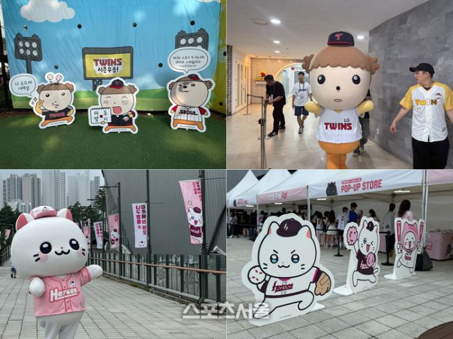 LG, 27~29일 KIA와 주말 3연전 ‘돌아온 무적 마루 데이’ 키움, 28일 삼성전 ‘영웅춘배데이’ 웹툰 캐릭터 시구한 날, 모두 ‘승리’…진기록까지! 네이버웹툰이 (위부터) 지난 27~29일 잠실구장에서 LG 트윈스와 진행한 ‘돌아온 무적 마루 데이’와 28일 고척스카이돔에서 펼친 키움 히어로즈와의 ‘영웅춘배데이’ 팝업 스토어. 사진 | 표권향 기자