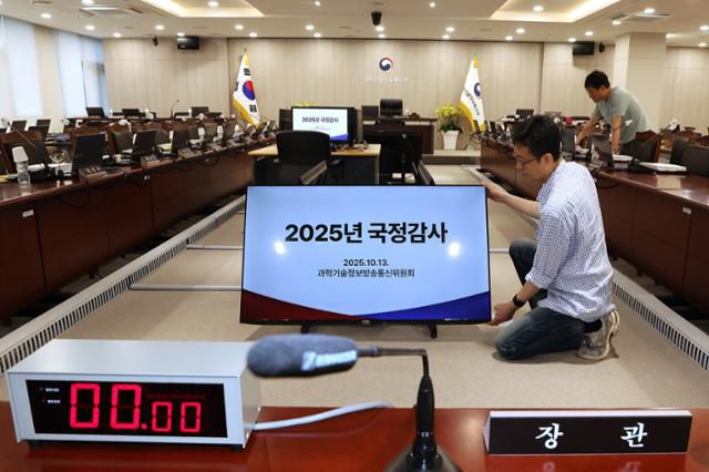 이재명 정부 첫 국정감사를 하루 앞둔 12일 정부세종청사 과학기술정보통신부에 마련된 국정감사장에서 직원들이 국감 준비를 하고 있다. 민주당은 이번 국감을 '내란 청산 국감'으로 규정해 윤석렬 정부를 겨냥한 고강도 감사를 예고한 반면, 국민의힘은 이재명 정부의 실정을 부각하며 국정 주도권을 되찾겠다고 벼르고 있다. 세종=연합뉴스