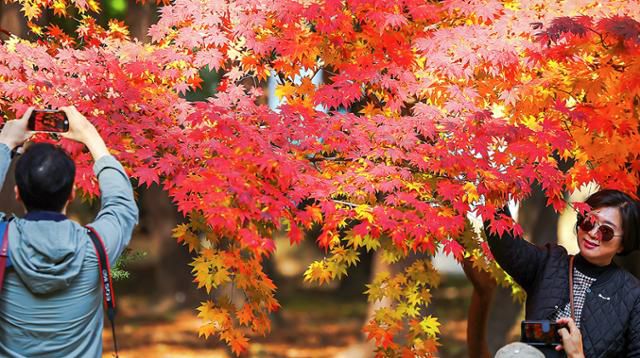 7일 서울 종묘를 찾은 시민들이 단풍을 찍으며 포근한 가을 날씨를 즐기고 있다. 이날은 절기상 겨울의 시작을 알리는 '입동'이었지만 전국 대부분 지역이 평년과 비슷하거나 다소 높은 기온을 보였다. 주말인 8일에는 강원영동과 경북북부동해안, 제주와 전남해안 등 일부 지역에 적은 양의 비가 내릴 예정이다. 내주 초 기온이 다소 낮아지겠지만 큰 추위는 오지 않아