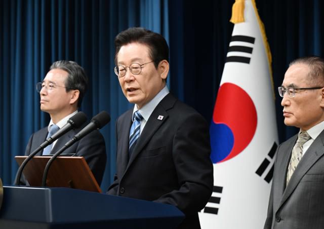 이재명 대통령이 14일 용산 대통령실에서 한미 관세·안보 협상 내용이 담긴 조인트 팩트시트(공동 설명자료)를 발표했다. 이 대통령은 핵추진 잠수함 건조 등 협상 성과를 소개하면서 "한미 양국이 함께 윈윈하는 한미동맹 르네상스의 문이 활짝 열렸다"고 평가했다. 왼쪽은 김용범 대통령실 정책실장, 오른쪽은 위성락 국가안보실장. 왕태석 선임기자