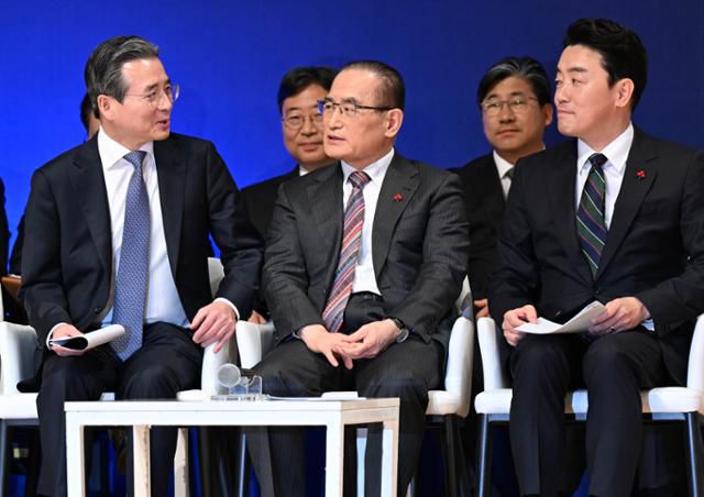 대통령실이 7일 용산 대통령실 청사에서 ‘이재명 정부 첫 6개월의 기록 국민께 보고드립니다’라는 제목의 성과 간담회를 개최했다. 성과 설명에 나선 김용범(왼쪽부터) 정책실장과 위성락 국가안보실장, 강훈식 대통령 비서실장이 간담회 시작 전 대화를 나누고 있다. 왕태석 선임기자