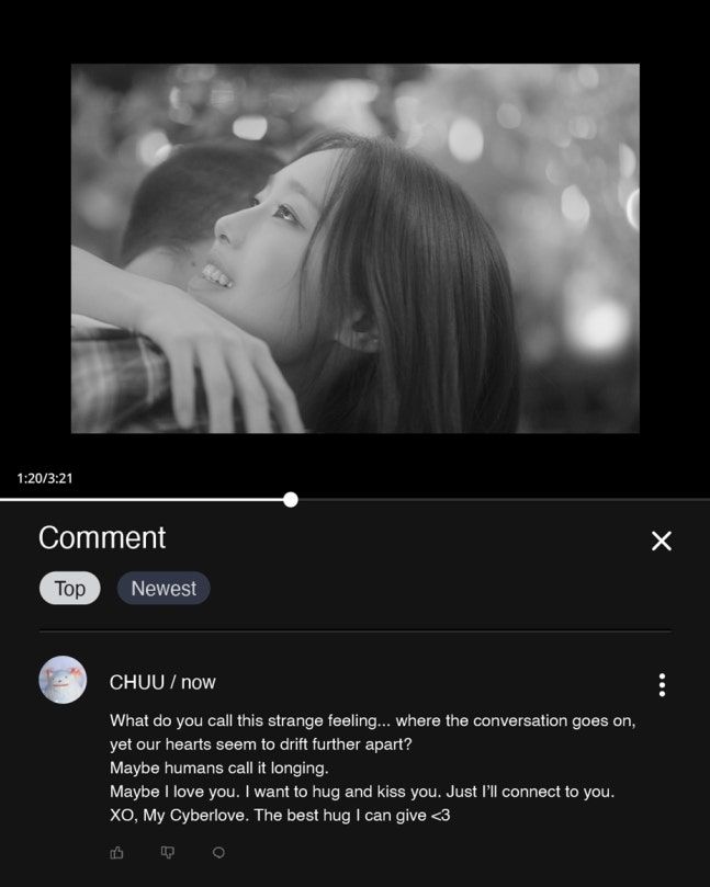 츄. 사진 | ATRP ‘인간 비타민’ 츄(CHUU)가 흑백 필름 속 한 장면처럼 포착됐다. 4일 소속사 ATRP는 SNS 채널을 통해 츄의 첫 정규 앨범 ‘XO, My Cyberlove’의 새로운 티저 이미지를 공개하며 컴백에 대한 기대감을 높였다. 티저는 SNS에 업로드된 영상이 멈춘 듯한 화면 아래 댓글 창이 함께 떠 있는 독특한 구성으로 시선을 사로