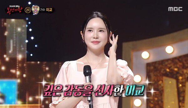 가수 미교가 MBC 예능 프로그램 '복면가왕'에서 복면 가수 '뾰로통'으로 출연해 실력을 입증하며, 정체 공개와 함께 컴백 소식을 알렸다. 미교는 지난 7월 6일 방송된 1라운드에서 나우즈 현빈(배시시)을 상대로 승리를 거뒀으며, 13일 방송된 2라운드에서는 임지수(생일카드)와 대결 후 가면을 벗고 정체를 공개했다. 방송에서 벤은 "호소력 짙고 감성적인 보