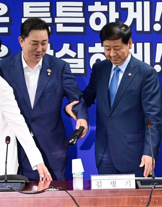 구윤철 경제부총리 겸 기획재정부 장관이 20일 오전 서울 여의도 국회 의원회관에서 열린 새정부 경제성장전략 당정협의에서 기념 촬영을 하기 위해 김병기 더불어민주당 원내대표(왼쪽)의 손을 잡고 있다.
