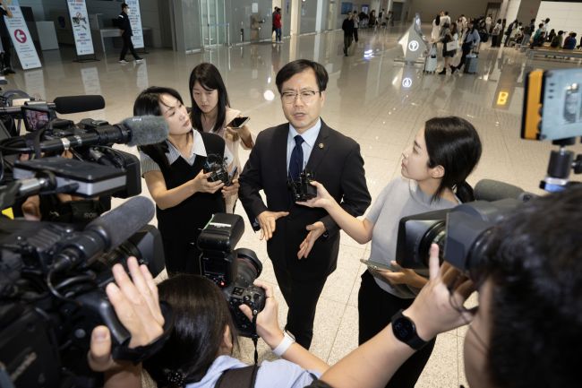 여한구(가운데) 산업통상자원부 통상교섭본부장이 한미 관세협상 관련 후속 협의를 위해 15일 오전 인천국제공항 제2여객터미널에서 미국 워싱턴DC로 출국하며 취재진의 질의에 답변하고 있다. 여 본부장은“국익에 부합하고 합리적인 협상 결과를 만들기 위해서 최선을 다하고 있다”고 밝혔다. 그는 하워드 러트닉 미 상무부 장관, 제이미슨 그리어 미국무역대표부(USTR