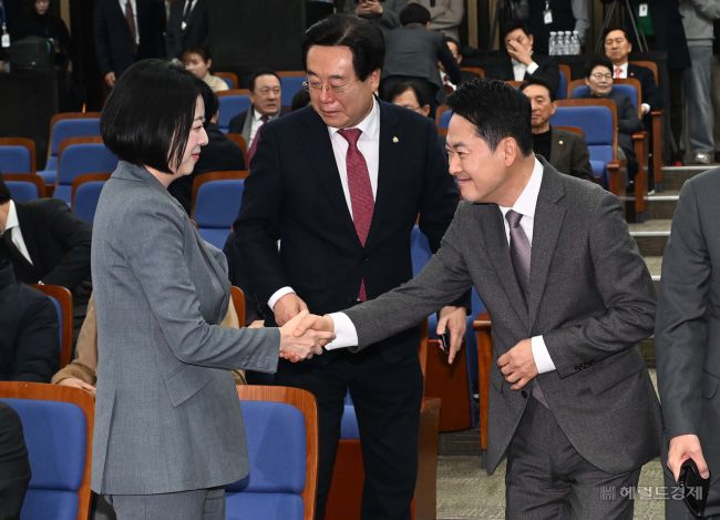 [헤럴드pic] 악수하는 장동혁 대표와 배현진 의원