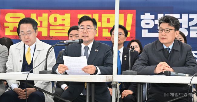 박찬대(가운데) 더불어민주당 원내대표가 27일 오전 서울 종로구 광화문 앞 천막당사에서 열린 정책조정회의에서 발언하고 있다.