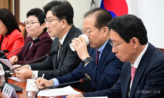 권영세 국민의힘 비대위원장이 31일 오전 서울 여의도 국회에서 열린 비상대책위원회의에 참석해 모두발언을 마치고 커피를 마시고 있다.