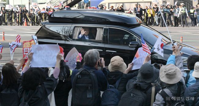 윤석열 전 대통령이 11일 오후 서울 용산구 한남동 대통령 관저에서 퇴거하며 지지자들과 인사하고 있다.
