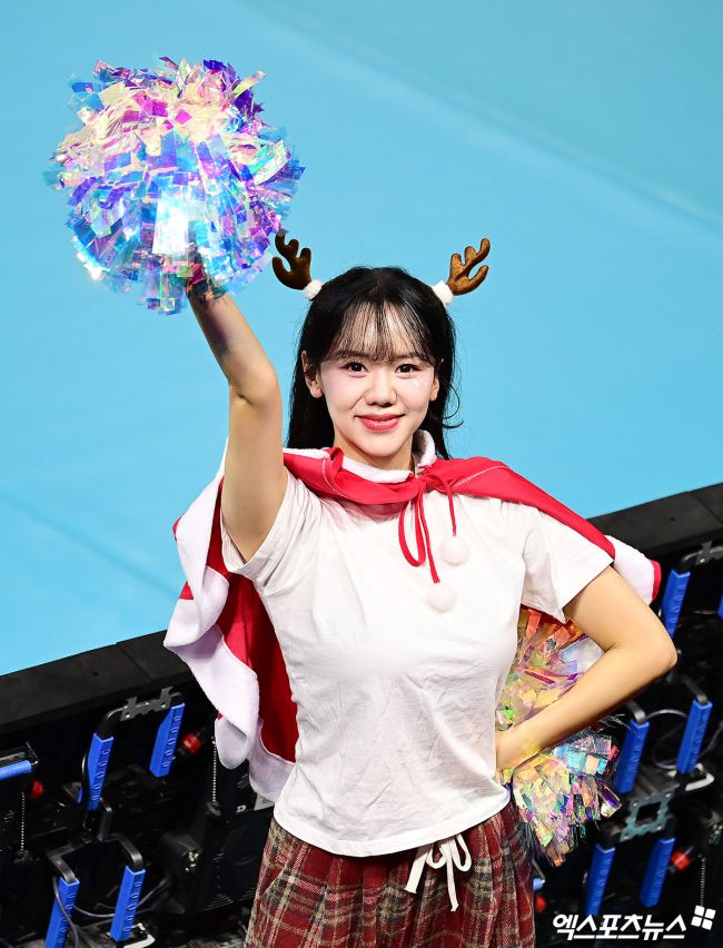 24일 오후 인천 삼산월드체육관에서 열린 '진에어 2025-2026 V-리그' 흥국생명과 IBK기업은행의 경기, 흥국생명 강지유 치어리더가 열띤 응원을 펼치고 있다. 박지영 기자 jypark@xportsnews.com