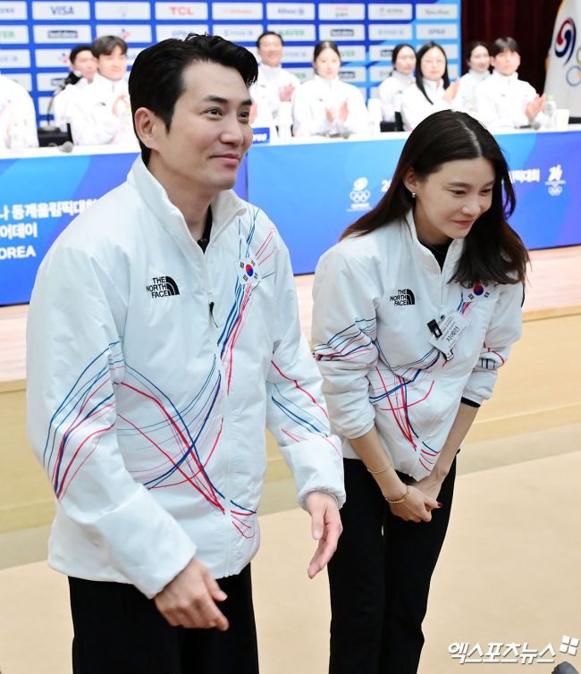 7일 오후 충북 대한체육회 진천국가대표선수촌에서 열린 2026 밀라노코르티나동계올림픽대회 D-30 미디어데이, 홍보대사인 주상욱 차예련 부부가 인사를 하고 있다. 김한준 기자 kowel@xportsnews.com