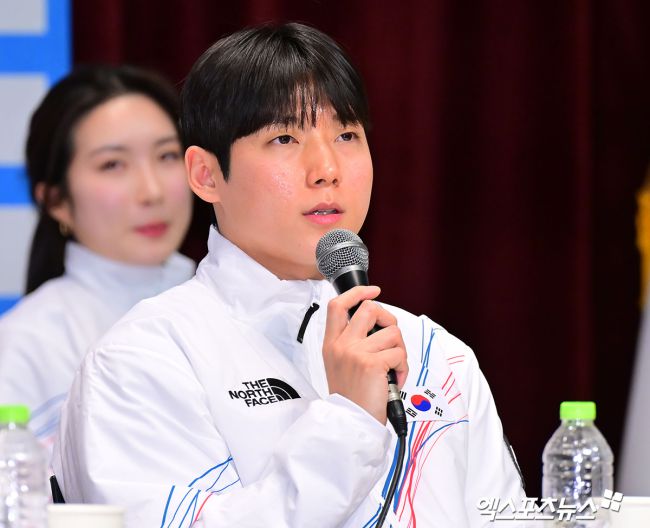 7일 오후 충북 대한체육회 진천국가대표선수촌에서 열린 2026 밀라노코르티나동계올림픽대회 D-30 미디어데이, 정영석이 취재지의 질문에 답하고 있다. 김한준 기자 kowel@xportsnews.com