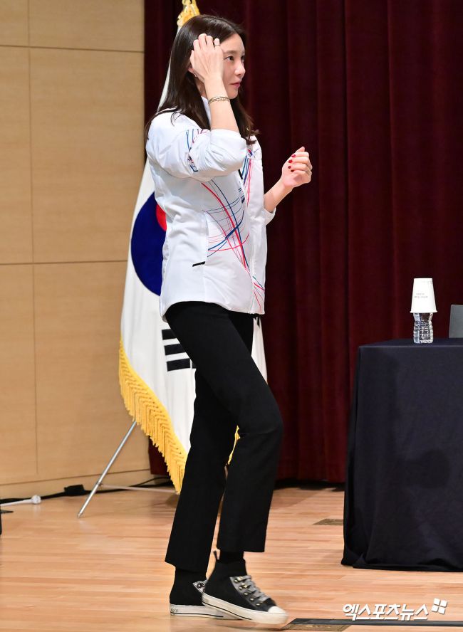 7일 오후 충북 대한체육회 진천국가대표선수촌에서 열린 2026 밀라노코르티나동계올림픽대회 D-30 미디어데이, 차예련이 무대에 오르고 있다. 김한준 기자 kowel@xportsnews.com