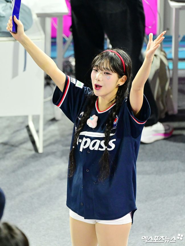 14일 오후 인천 부평구 삼산월드체육관 열린 '진에어 2025-2026 V-리그' 흥국생명과 한국도로공사의 경기, 지아영 치어리더가 열띤 응원을 선보이고 있다. 김한준 기자 kowel@xportsnews.com
