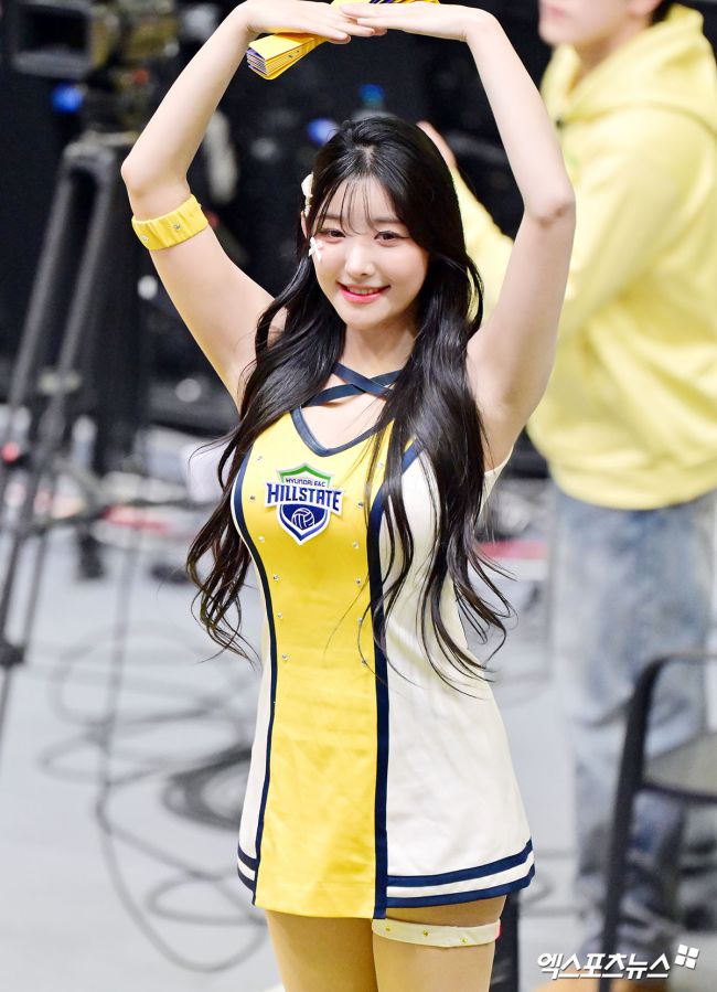 21일 오후 경기도 수원실내체육관에서 열린 '진에어 2025-2026 V-리그' 현대건설과 기업은행의 경기, 고가빈 치어리더가 열띤 응원을 선보이고 있다. 김한준 기자 kowel@xportsnews.com