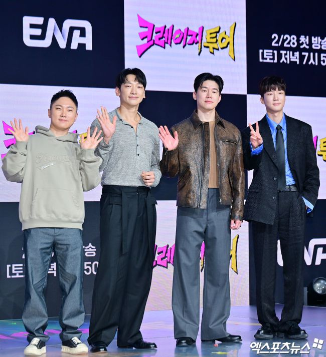 27일 오후 서울 상암동 쇼킹케이팝센터에서 ENA '크레이지 투어' 제작발표회가 진행됐다. 이날 제작발표회에 참석한 빠니보틀, 비, 김무열, 위너 이승훈이 포즈를 취하고 있다. 김한준 기자 kowel@xportsnews.com