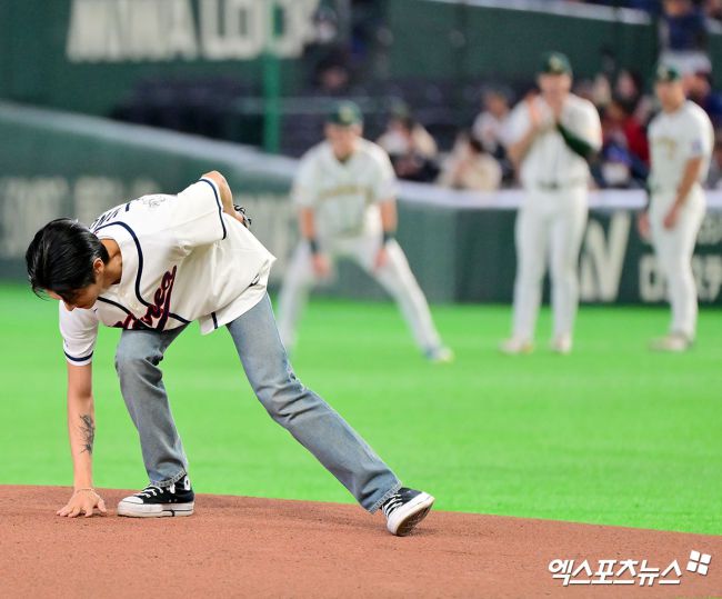 9일 오후 일본 도쿄돔에서 열린 2026 월드베이스볼클래식(WBC) C조 한국과 호주의 경기, 에이티즈 우영이 시구 후 손으로 마운드를 정리하고 있다. 김한준 기자 kowel@xportsnews.com