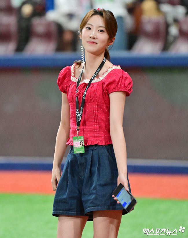 5일 오후 서울 구로구 고척스카이돔에서 열린 '2025 신한 SOL Bank KBO리그' 한화 이글스와 키움 히어로즈의 경기, 한화가 리베라토의 결승타에 힘입어 키움에 6:4로 승리했다. 경기종료 후 KBSN 최서임 아나운서가 수훈선수 인터뷰를 준비하고 있다. 김한준 기자 kowel@xportsnews.com