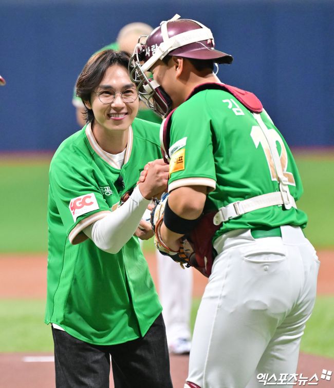 6일 오후 서울 구로구 고척스카이돔에서 열린 '2025 신한 SOL Bank KBO리그' 한화 이글스와 키움 히어로즈의 경기, 경기 전 시구를 마친 가수 이석훈이 김건희와 인사를 나누고 있다. 김한준 기자 kowel@xportsnews.com