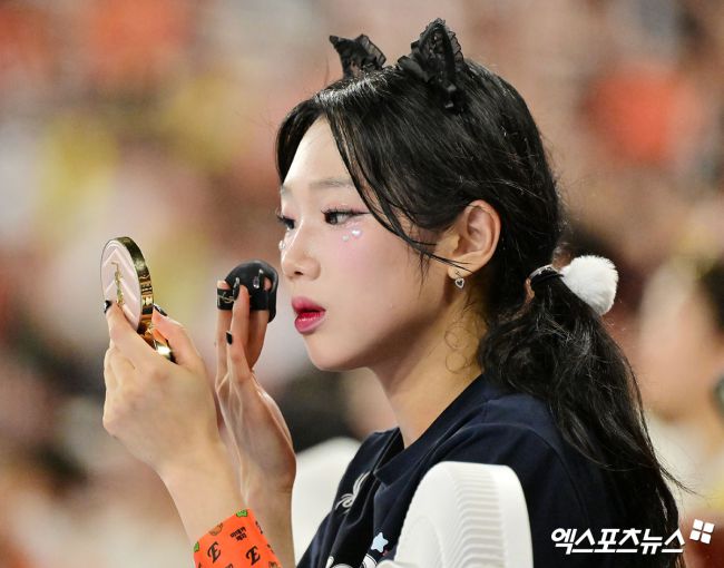8일 오후 대전 한화생명 볼파크에서 열린 '2025 신한 SOL Bank KBO리그' KIA 타이거즈와 한화 이글스의 경기, 지아영 치어리더가 화장을 고치고 있다. 김한준 기자 kowel@xportsnews.com