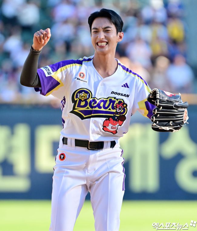 26일 오후 서울 송파구 잠실야구장에서 열린 '2025 신한 SOL Bank KBO리그' LG 트윈스와 두산 베어스의 경기, 경기 전 세븐틴 도겸이 시구에 임하고 있다. 김한준 기자 kowel@xportsnews.com