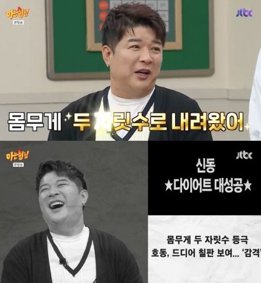 신동이 몸무게 두자릿수로 내려왔다. 22일 방송된 JTBC '아는 형님'에는 전 농구선수 전태풍, 배우 박은석, 가수 손태진, 정진운이 출연했다. 이날 강호동은 신동을 보자마자 "어딨니 신동! 갑자기 살 빠졌는데?"라며 깜짝 놀라는 제스처를 취했다. 그러면서 강호동은 "맨 처음 신동이 앞에 있었을 때는 앞이 안 보일 정도로 답답했다. 그런데 어느 순간 다이